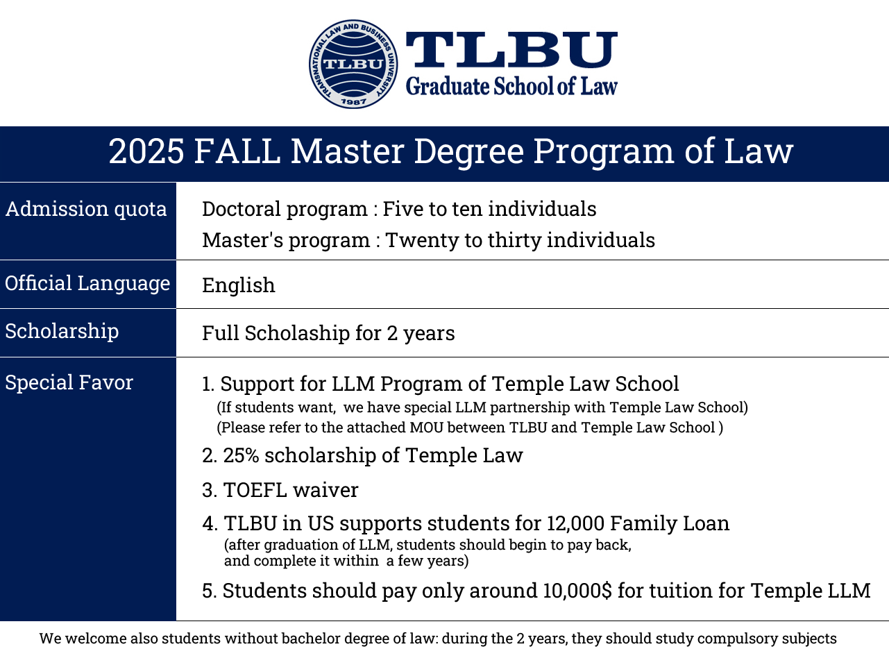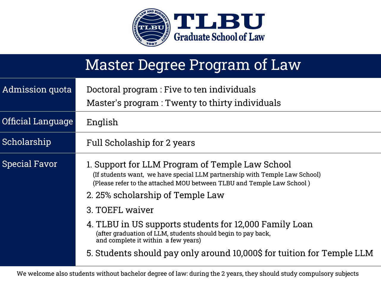TLBU Law School will fulfill the responsibility of regional cooperation and world peace by spearheading the basic role of law school in legal education and research. We will prepare for the future by sharing and practicing the values of Peace, Cooperation, and Connectivity that constitute the founding spirit of TLBU.